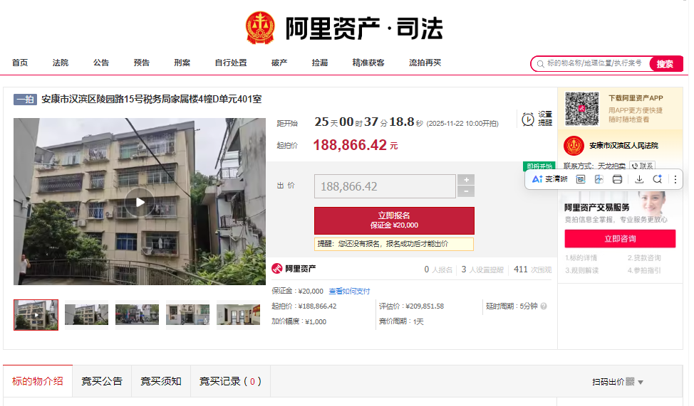起拍价:188866.42元,保证金:20000元,加价幅度:1000元。