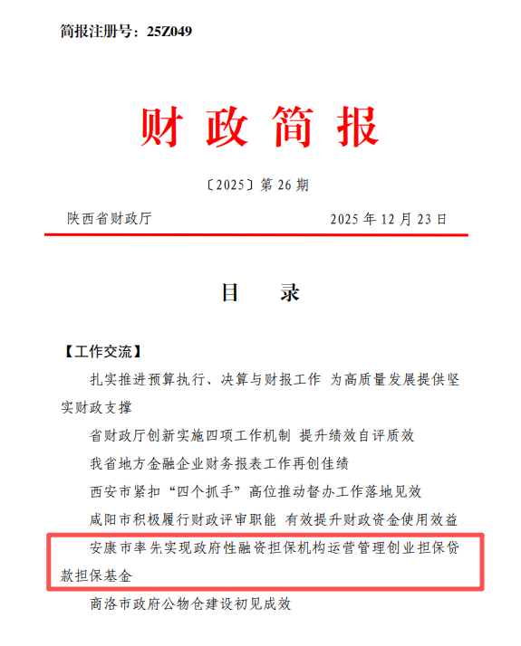 近日,陕西省财政厅印发《陕西财政简报》(2025年第26期),刊发《安康市率先实现政府性融资担保机构运营管理创业担保贷款担保基金》文章,关注肯定安康市政府性融资担保机构运营管理创业担保贷款担保基金创新实践与成效。